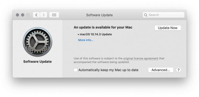 L’aggiornamento macOS mojave 10.14.3 migliora la sicurezza, la stabilità e la compatibilità del tuo Mac ed è consigliato a tutti gli utenti.