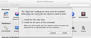 1 . Scarica l’applicazione dal sito web AppTrap, poi avviala. Si aprirà l’applicazione nelle Preferenze di Sistema, ma prima di farlo vi chiederà quale account si desidera caricare – solo il tuo o di tutti gli account del computer. Ti verrà chiesto il nome e la password per installare completamente.