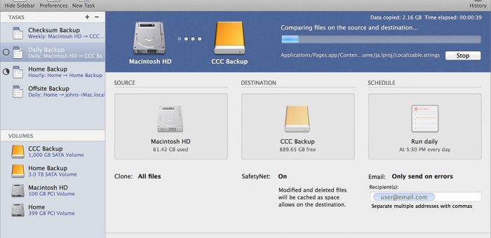 Se vogliamo, questo non è un vero strumento da clonazione, e ha anche un costo – anche se è possibile provare sempre una versione Trial. ChronoSync ci da la possibilità di lasciar copiare continuamente tutti i file del nostro Mac OS, in poche parole il disco principale viene clonato continuamente ma solo nei file individuali, così l’impatto sulla velocità è minimo.